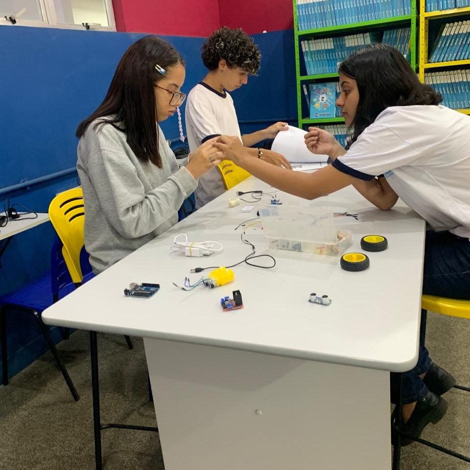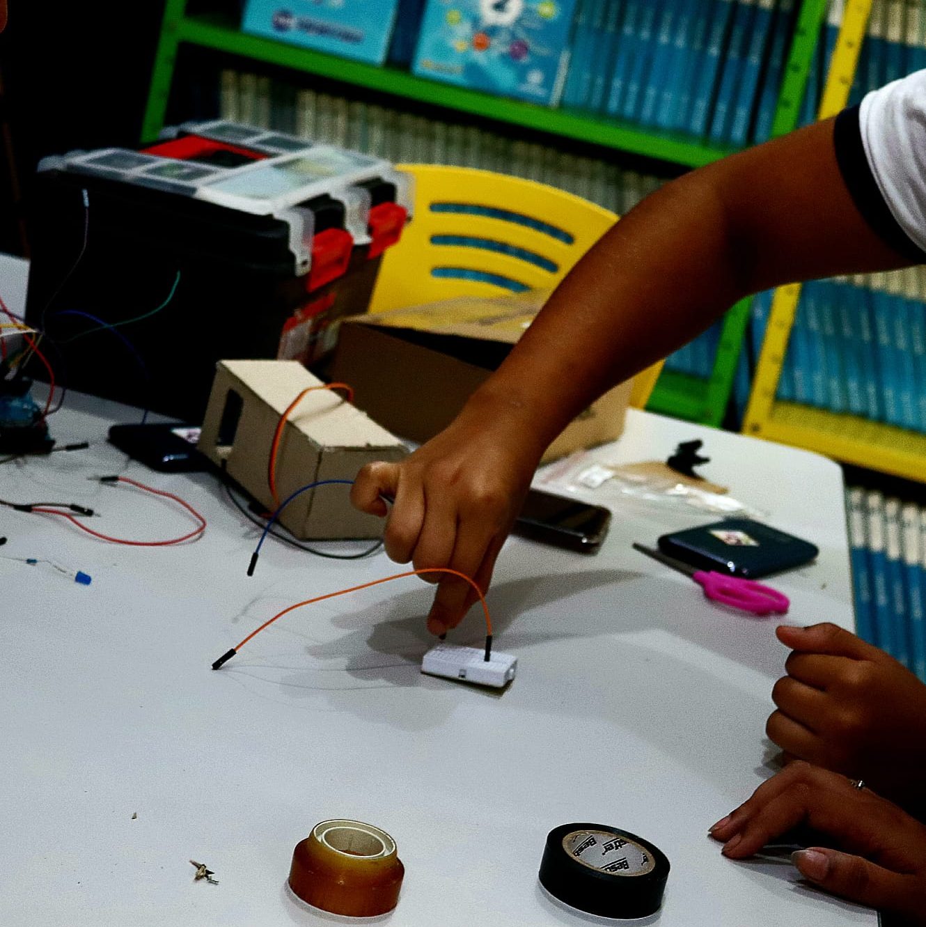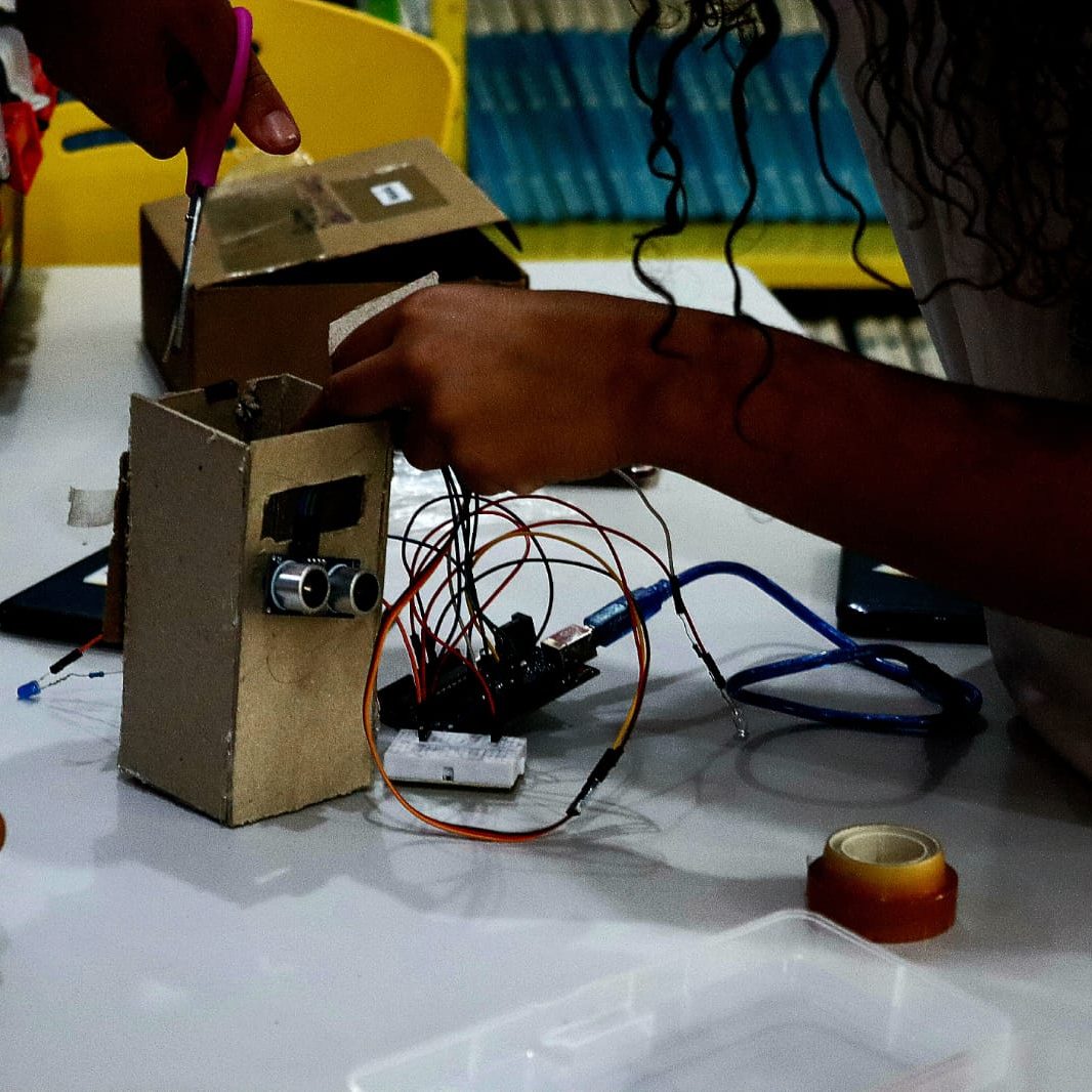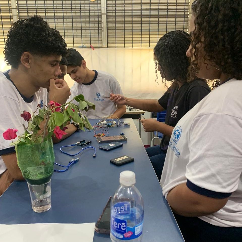 Durante 4 horas de atividades, foram apresentados três miniprojetos: Flores de LED , Nível da Água e Umidade , permitindo que os alunos explorassem conceitos de eletrônica, sensores e programação de forma lúdica e educativa.