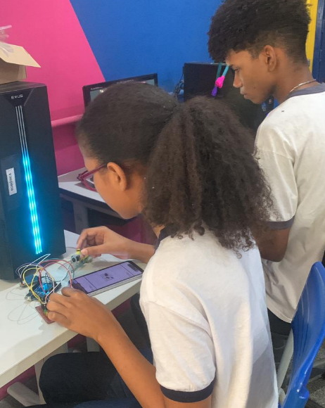 Durante 4 horas de atividades, foram apresentados três miniprojetos: Flores de LED , Nível da Água e Umidade , permitindo que os alunos explorassem conceitos de eletrônica, sensores e programação de forma lúdica e educativa.