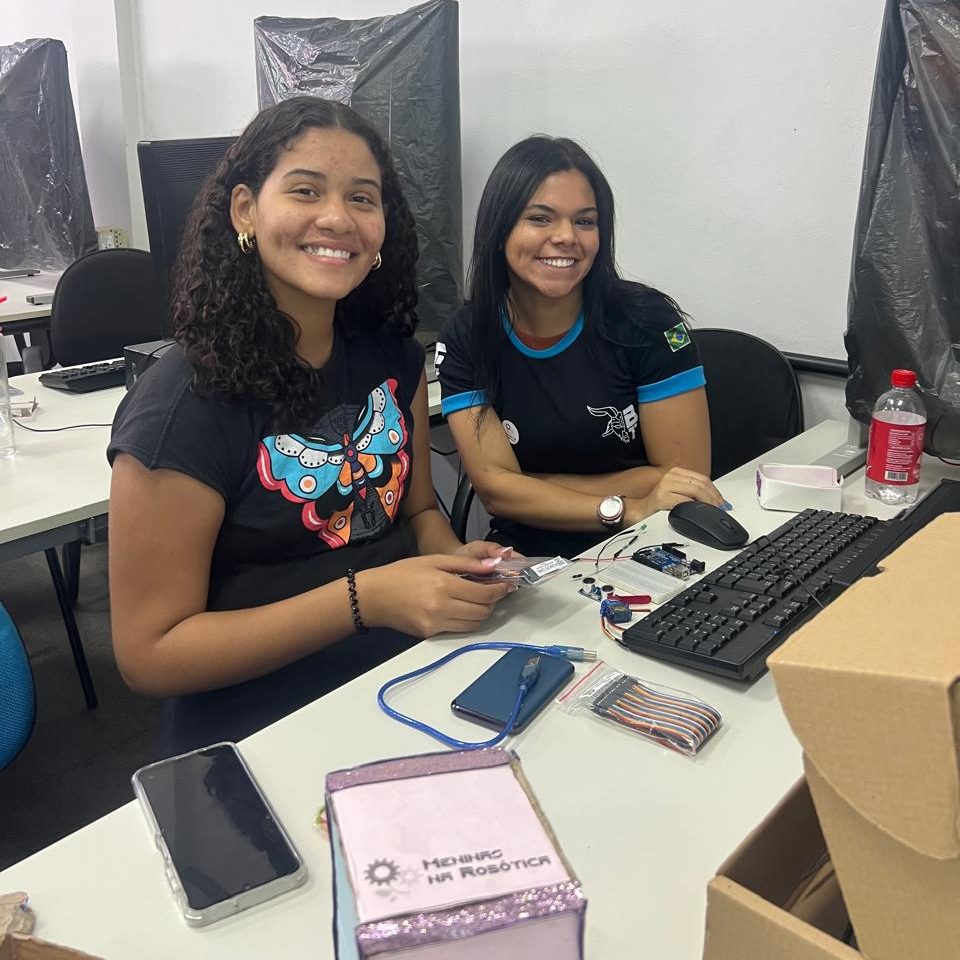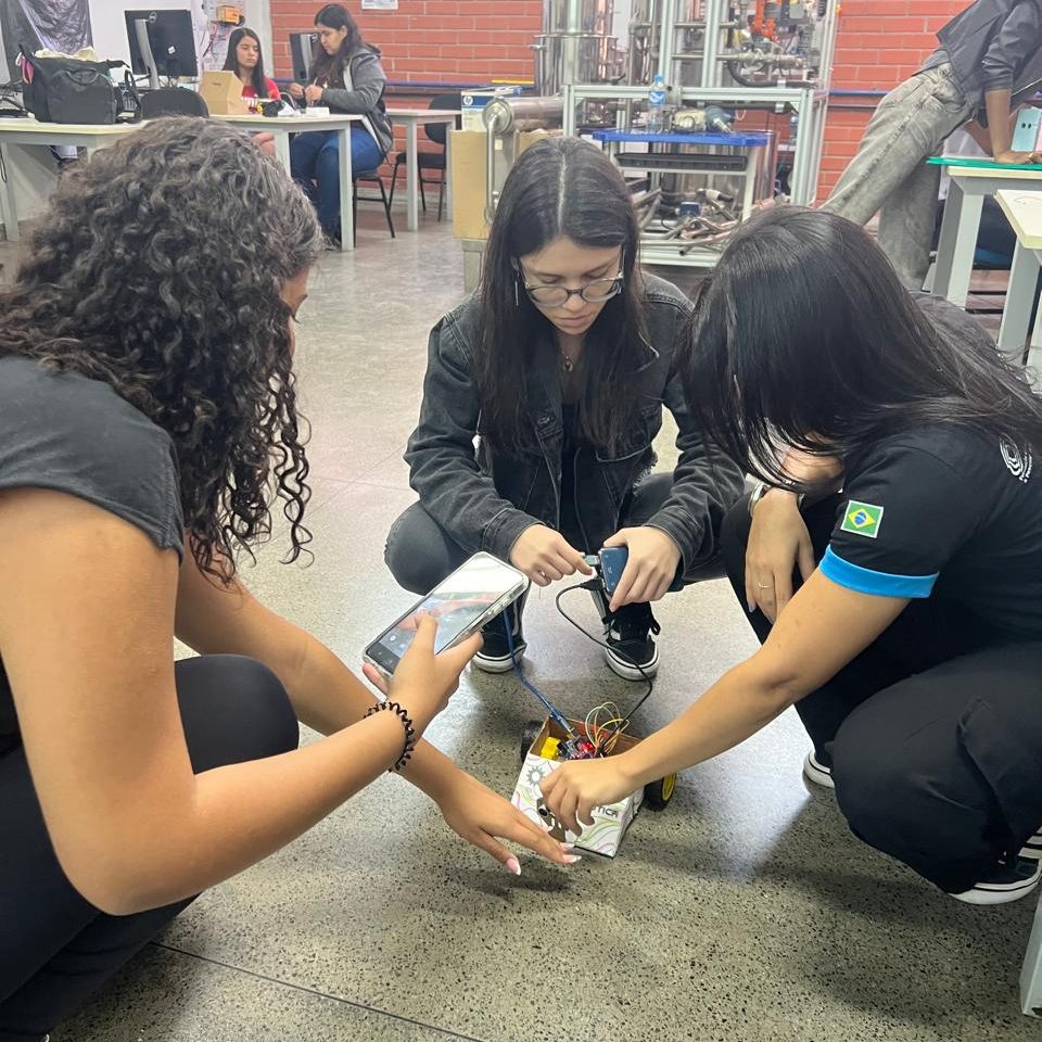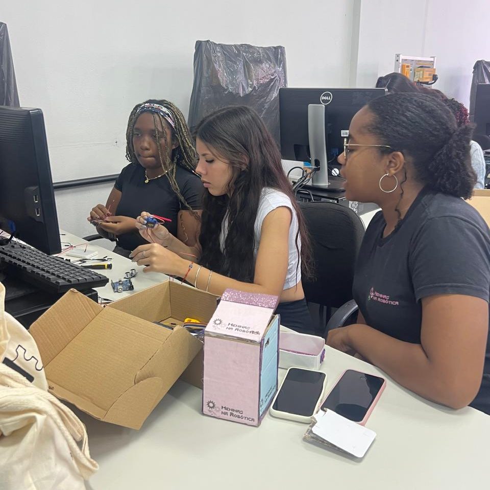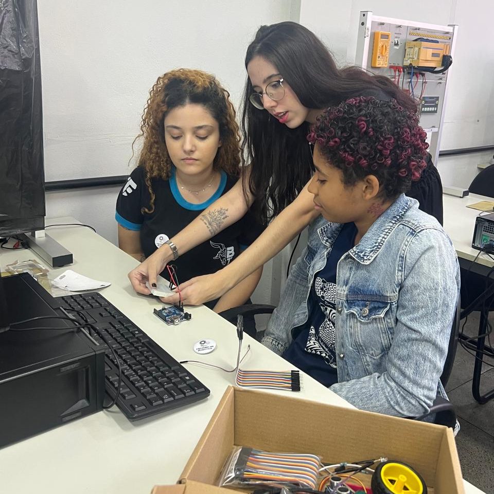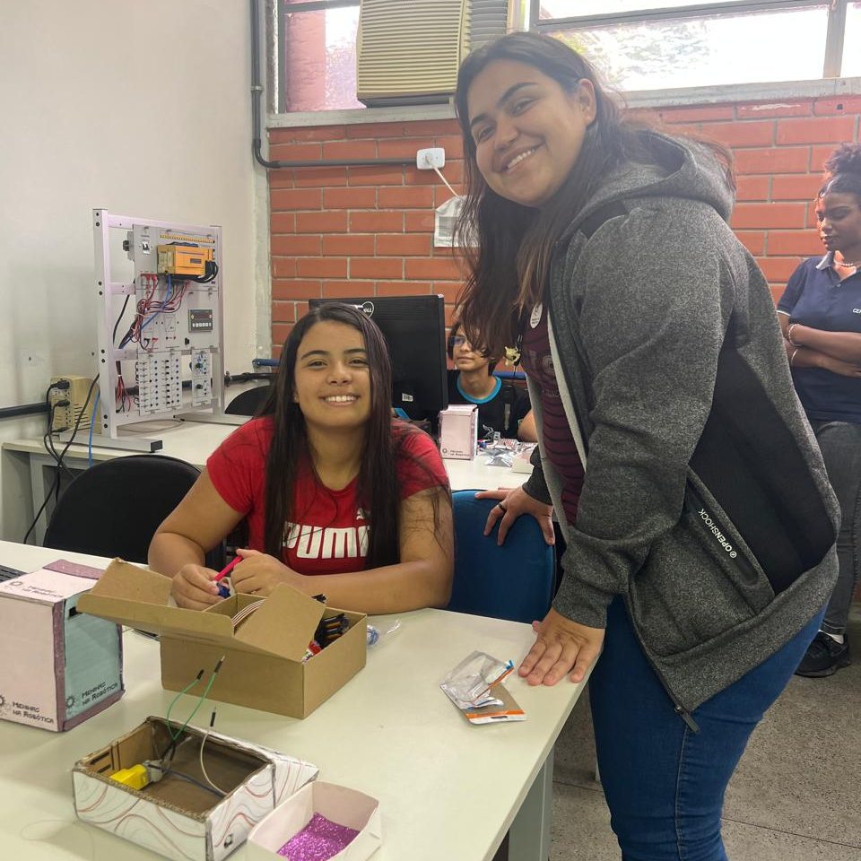 Além das atividades práticas, as integrantes compartilharam suas experiências no curso de Engenharia e no próprio projeto, reforçando a importância da representatividade feminina na tecnologia e incentivando mais meninas a se conectarem com a ciência.