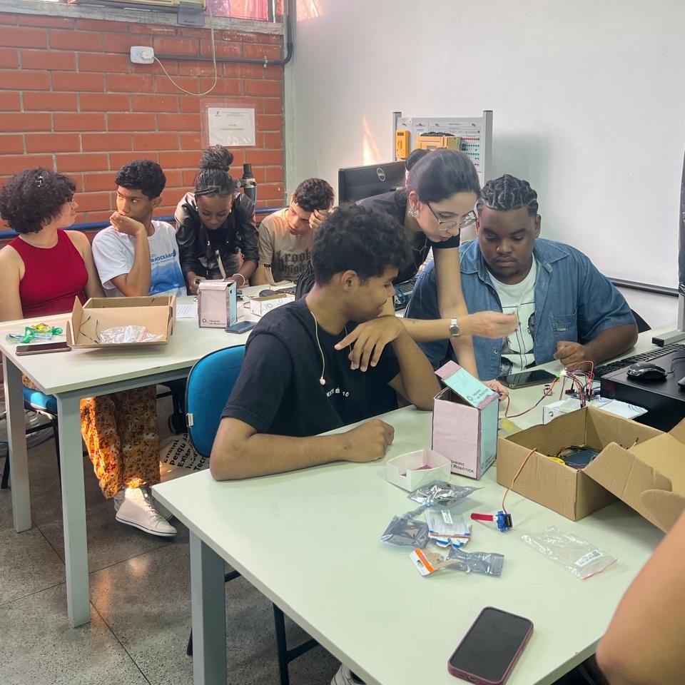 Os participantes puderam conhecer e montar alguns dos miniprojetos desenvolvidos pelo projeto, como a Lixeira Ultrassônica, o Carrinho Ultrassônico e o Carrinho Bluetooth, explorando conceitos de eletrônica, sensores e controle de forma dinâmica e acessível.