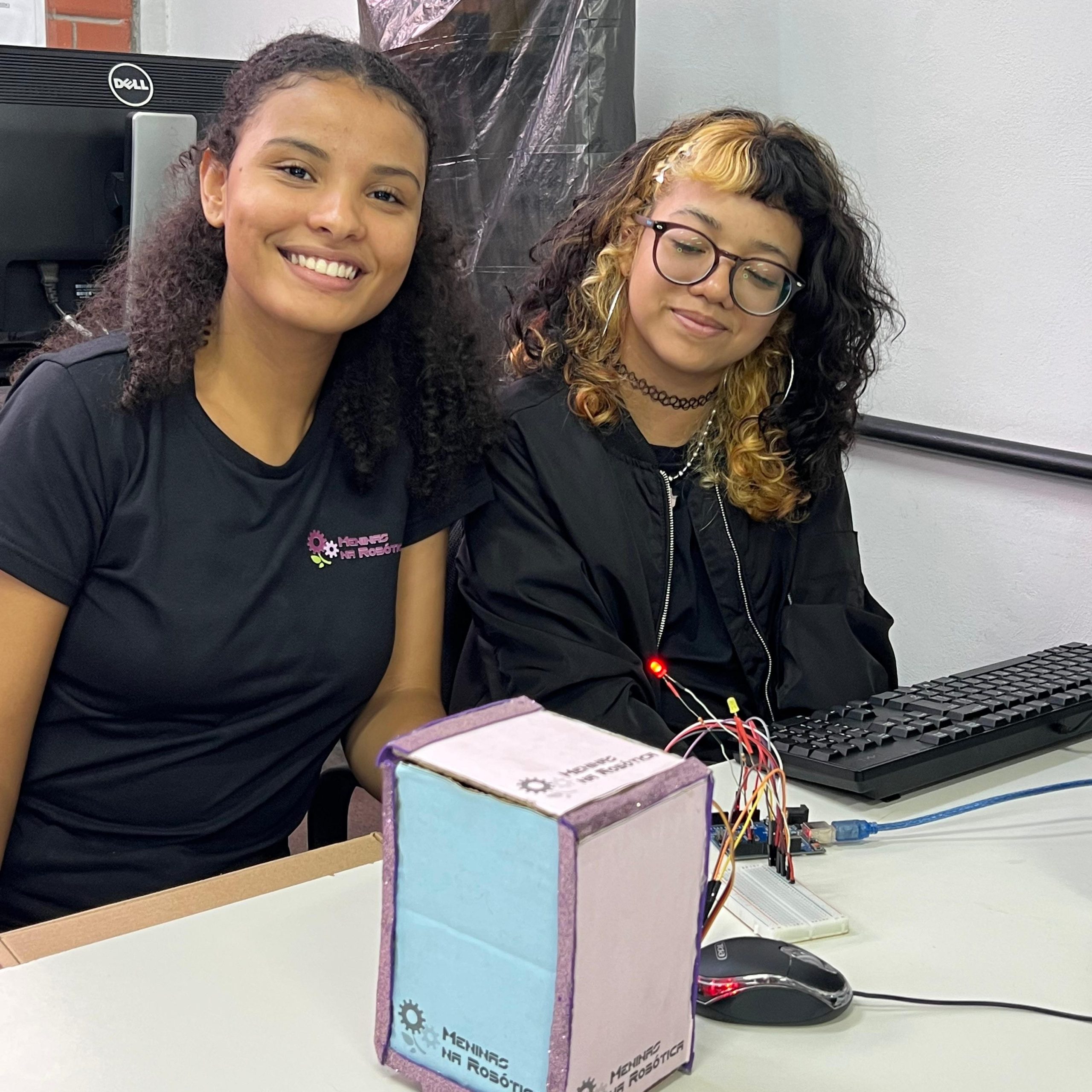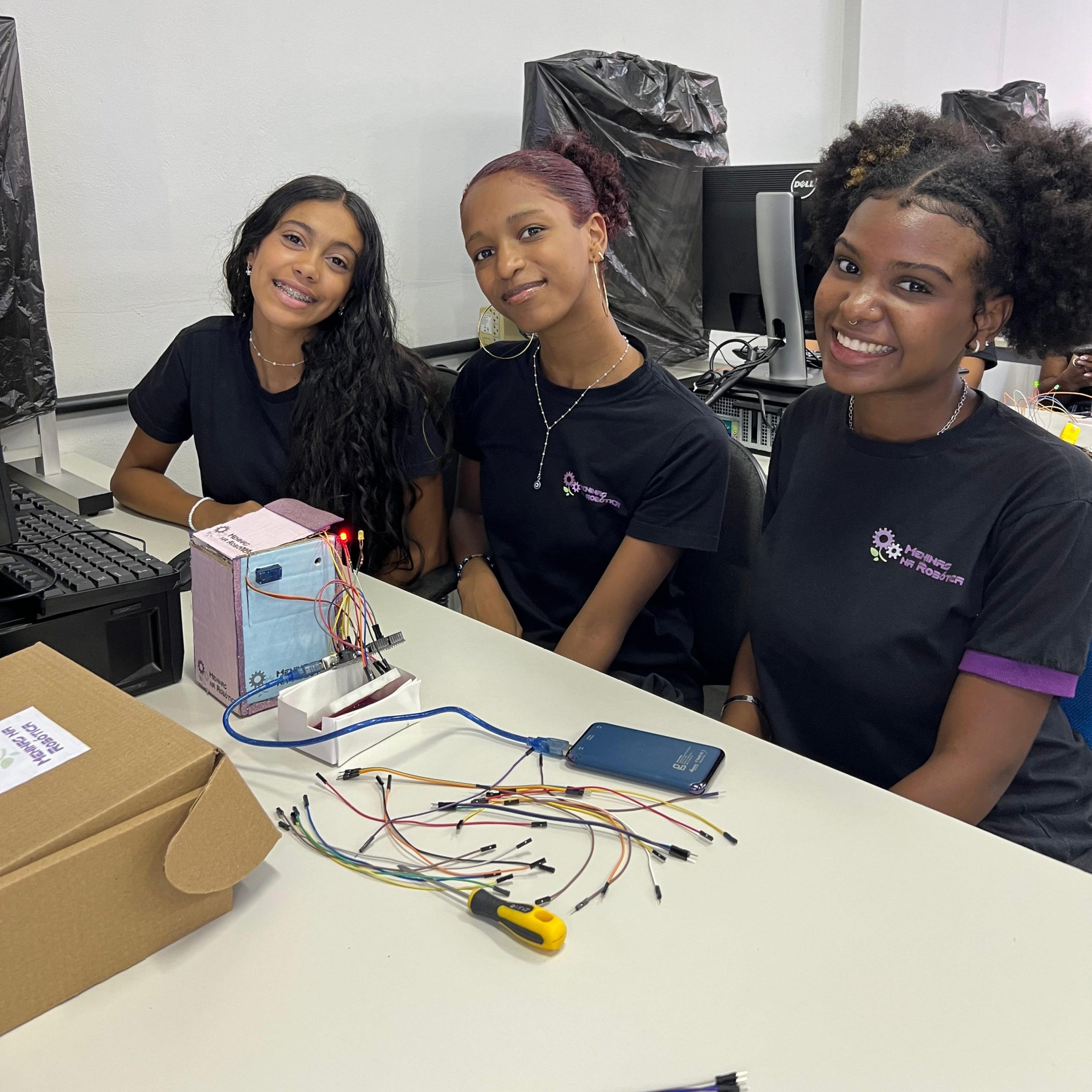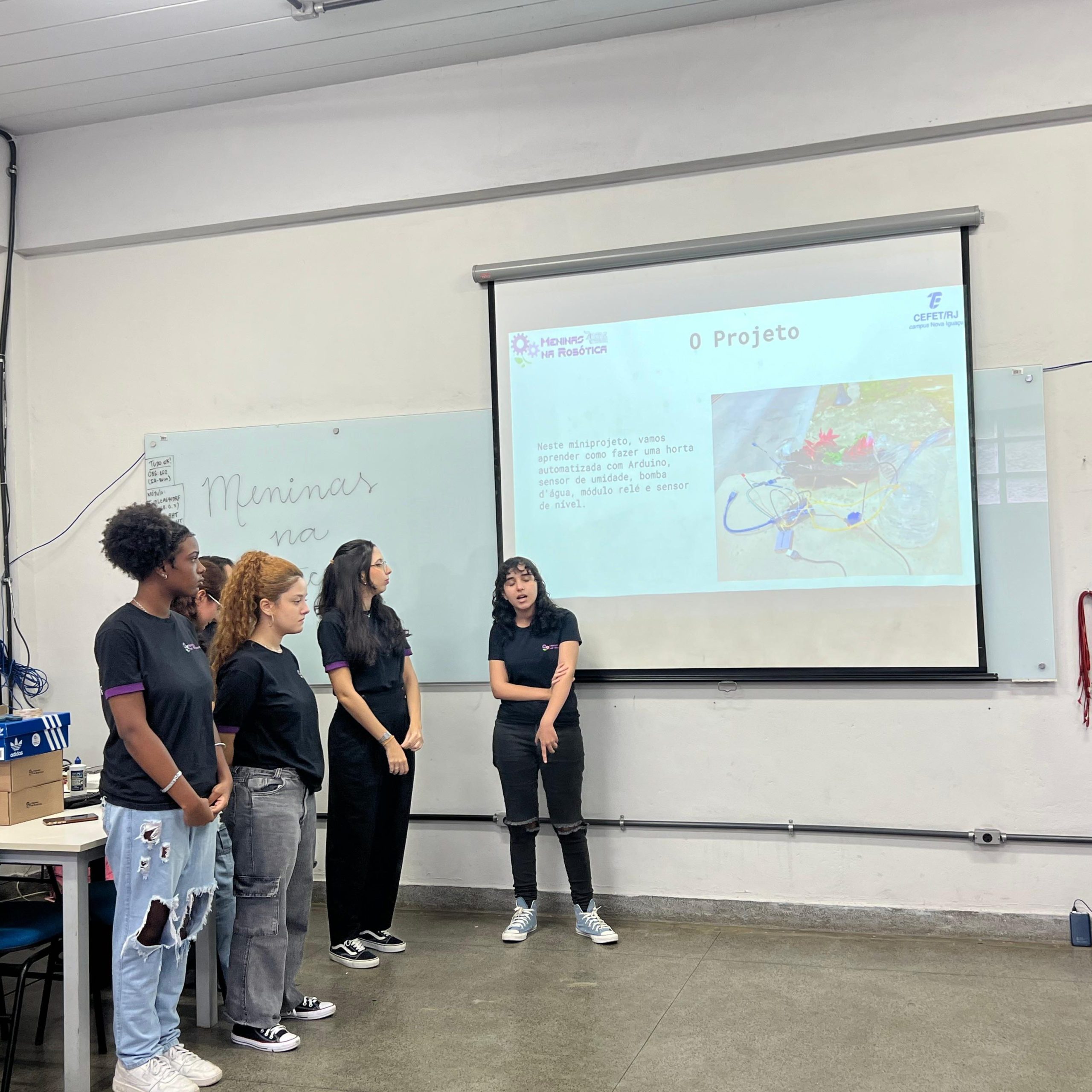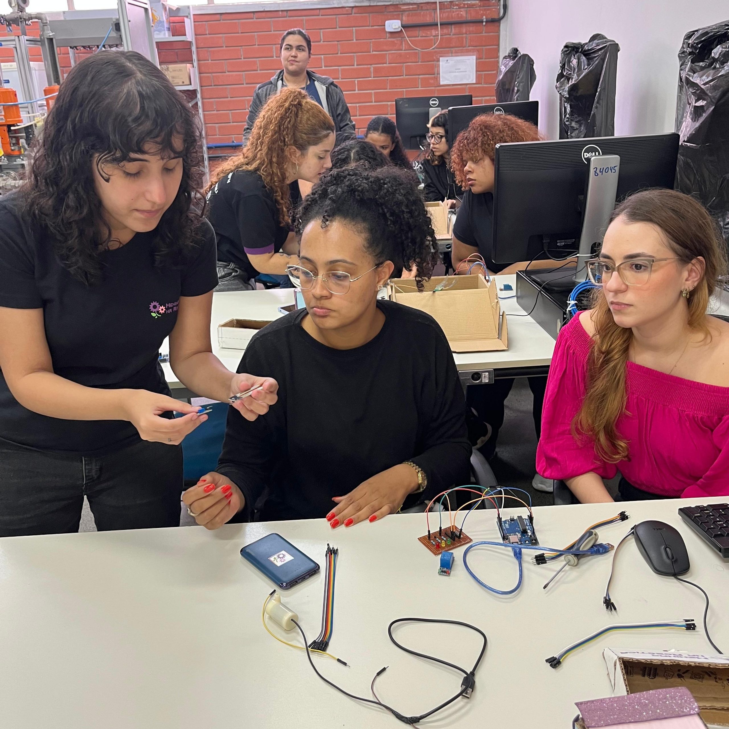 Na parte técnica, as participantes desenvolveram miniprojetos práticos, com o objetivo de estimular o aprendizado mão na massa e o trabalho em equipe. Entre os projetos desenvolvidos, destacam-se o carrinho ultrassônico, a lixeira automatizada com sensor, a horta automatizada e o ventilador controlado por circuito eletrônico. Essas atividades proporcionaram uma vivência introdutória em conceitos de eletrônica, automação e programação.
