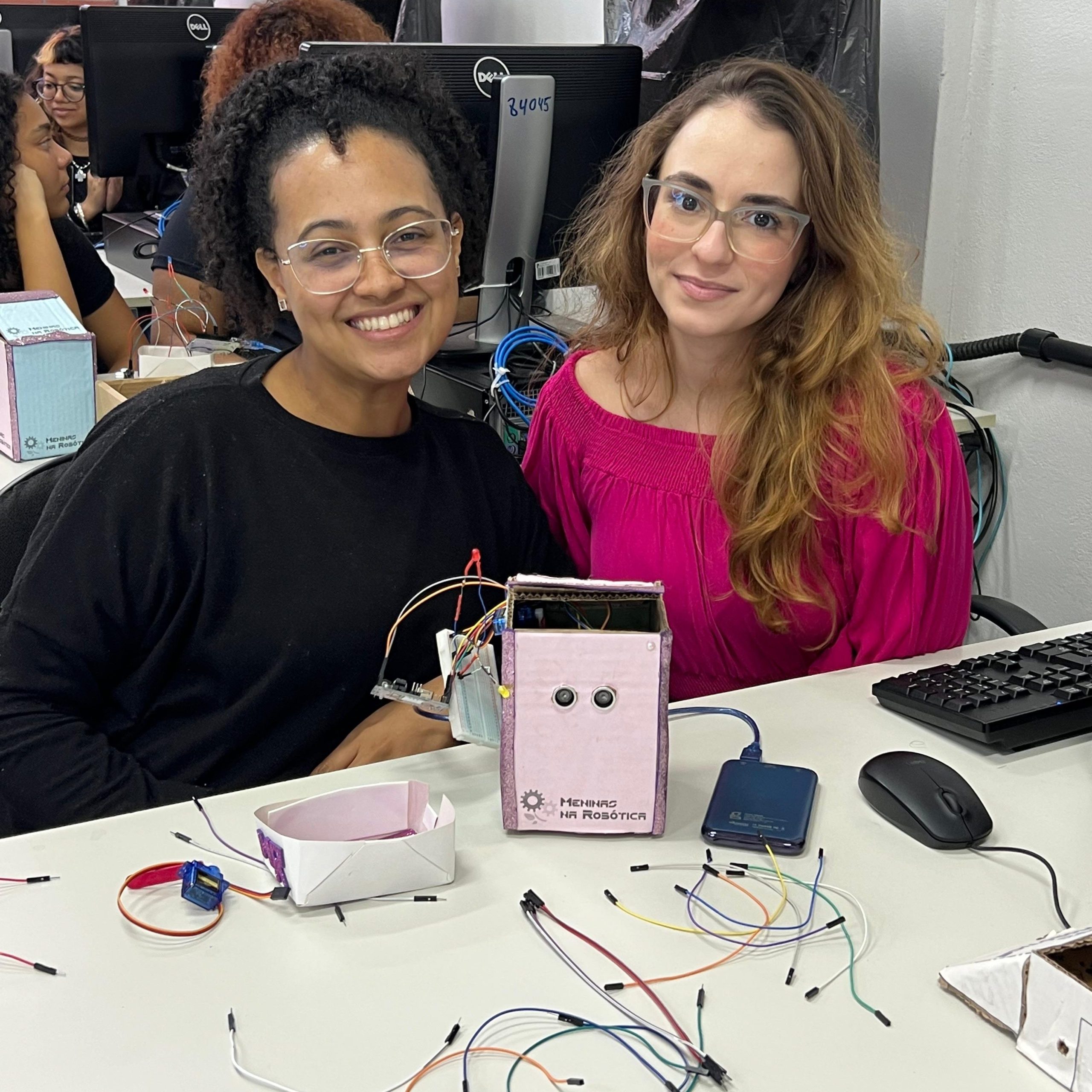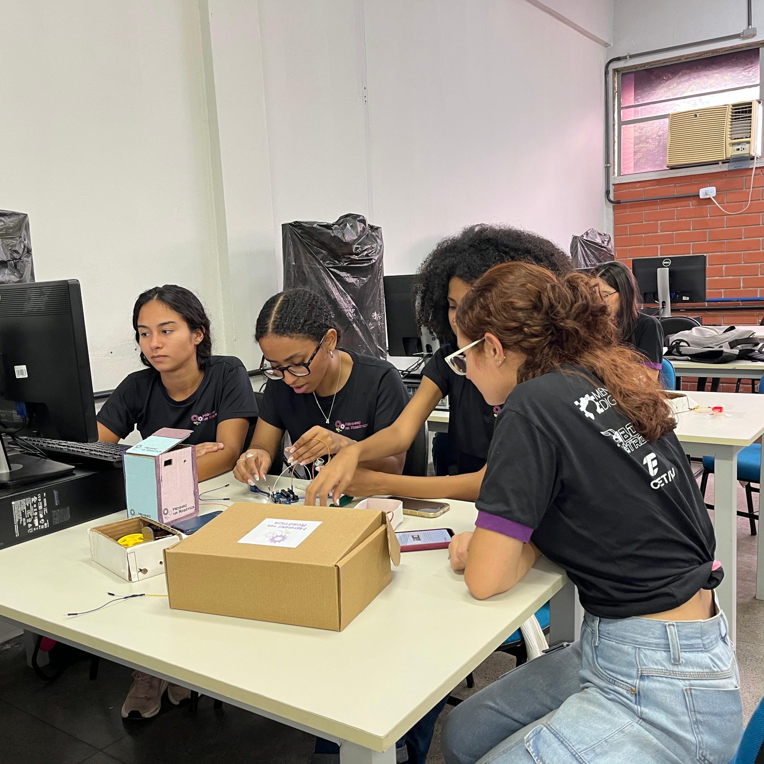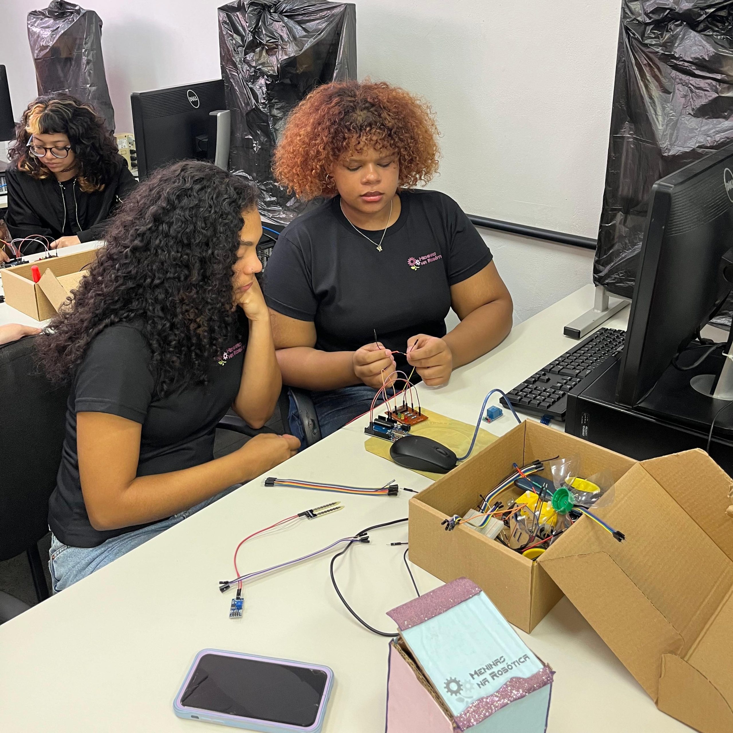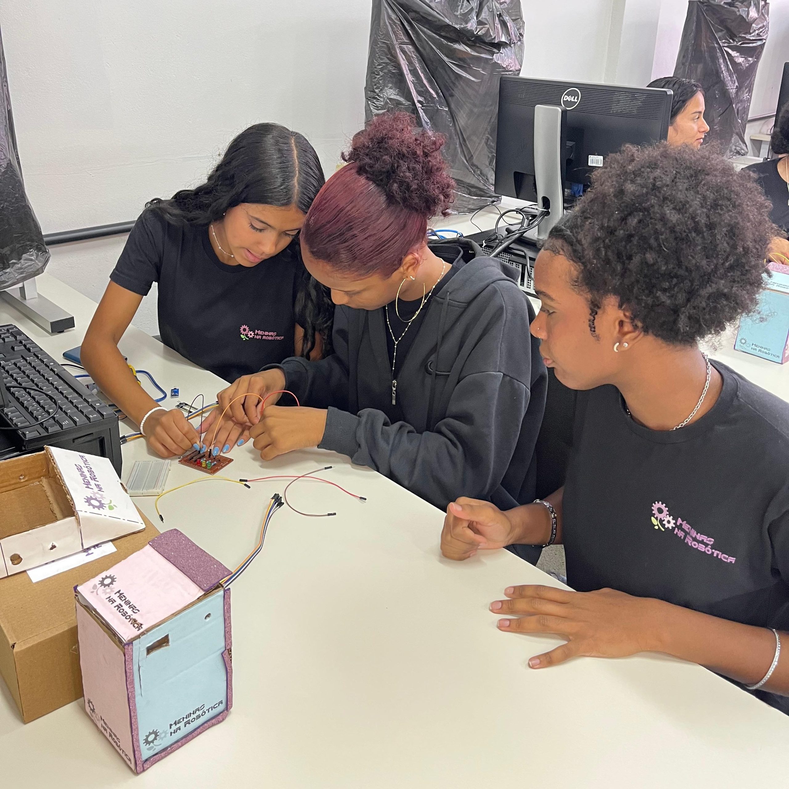 Na parte técnica, as participantes desenvolveram miniprojetos práticos, com o objetivo de estimular o aprendizado mão na massa e o trabalho em equipe. Entre os projetos desenvolvidos, destacam-se o carrinho ultrassônico, a lixeira automatizada com sensor, a horta automatizada e o ventilador controlado por circuito eletrônico. Essas atividades proporcionaram uma vivência introdutória em conceitos de eletrônica, automação e programação.